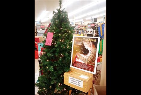 Locals can help with the effort by picking a tag from a Christmas tree at 13 locations in Lake County, buying a gift and bringing it to Share the Spirit’s drop-off location at the Core building at 36235 Kerr Dam Road next to the old soccer and baseball fields. The trees, are located at Walmart, several area banks and Cherry Valley and Linderman elementary schools in Polson.